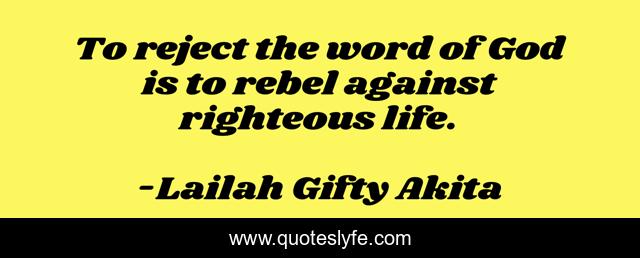 This page presents the quote "To reject the word of God is to rebel against righteous life.". Author of this quote is Lailah Gifty Akita. This quote is about reject, encouragement, rebel, life-lessons, self-help, righteous,.