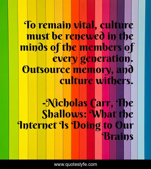 This page presents the quote "To remain vital, culture must be renewed in the minds of the members of every generation. Outsource memory, and culture withers.". Author of this quote is Nicholas Carr, The Shallows: What the Internet Is Doing to Our Brains. This quote is about culture, brain, internet, mind, memory,.