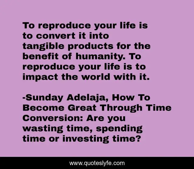 This page presents the quote "To reproduce your life is to convert it into tangible products for the benefit of humanity. To reproduce your life is to impact the world with it.". Author of this quote is Sunday Adelaja, How To Become Great Through Time Conversion: Are you wasting time, spending time or investing time?. This quote is about life, reproduce-your-life, benefits-of-humanity, conversion, productivity, wealth, greatness, waste, humanity,.