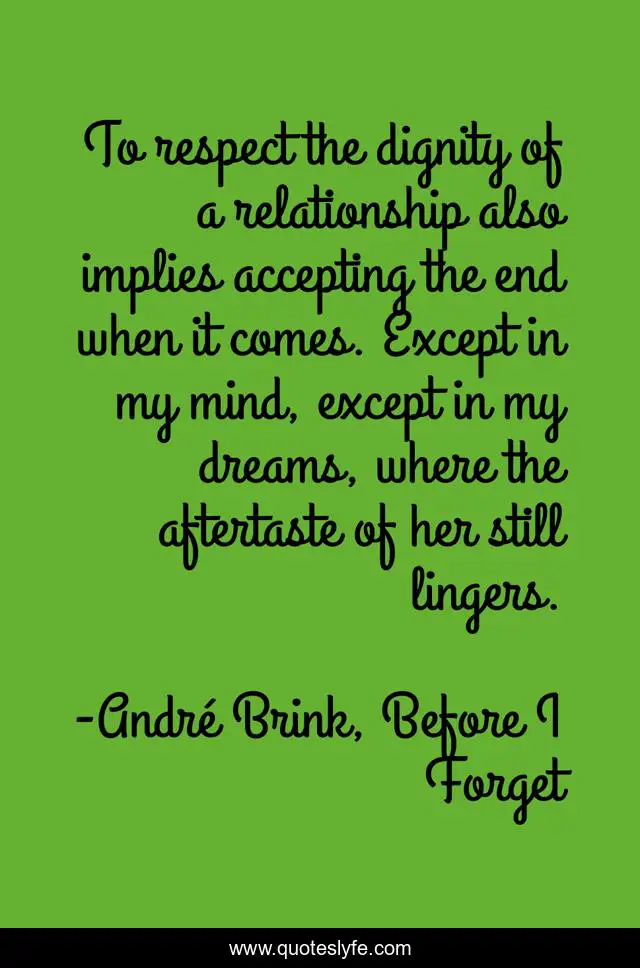 This page presents the quote "To respect the dignity of a relationship also implies accepting the end when it comes. Except in my mind, except in my dreams, where the aftertaste of her still lingers.". Author of this quote is André Brink, Before I Forget. This quote is about relationships, acceptance, endings,.