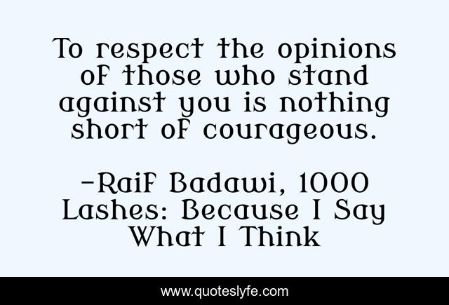 This page presents the quote "To respect the opinions of those who stand against you is nothing short of courageous.". Author of this quote is Raif Badawi, 1000 Lashes: Because I Say What I Think. This quote is about freedom-of-speech, freespeech, liberty, courage, pluralism, opinion,.
