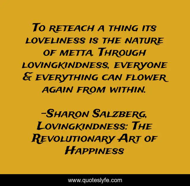 This page presents the quote "To reteach a thing its loveliness is the nature of metta. Through lovingkindness, everyone & everything can flower again from within.". Author of this quote is Sharon Salzberg, Lovingkindness: The Revolutionary Art of Happiness. This quote is about buddhism, lovingkindness, mindfulness,.
