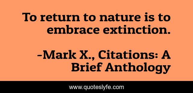 This page presents the quote "To return to nature is to embrace extinction.". Author of this quote is Mark X., Citations: A Brief Anthology. This quote is about survival, extinction, primitivism, nature,.