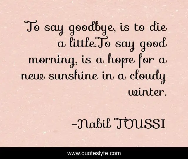This page presents the quote "To say goodbye, is to die a little.To say good morning, is a hope for a new sunshine in a cloudy winter.". Author of this quote is Nabil TOUSSI. This quote is about clouds, winter, die, sunshine, good-morning, morning, goodbye, hope,.