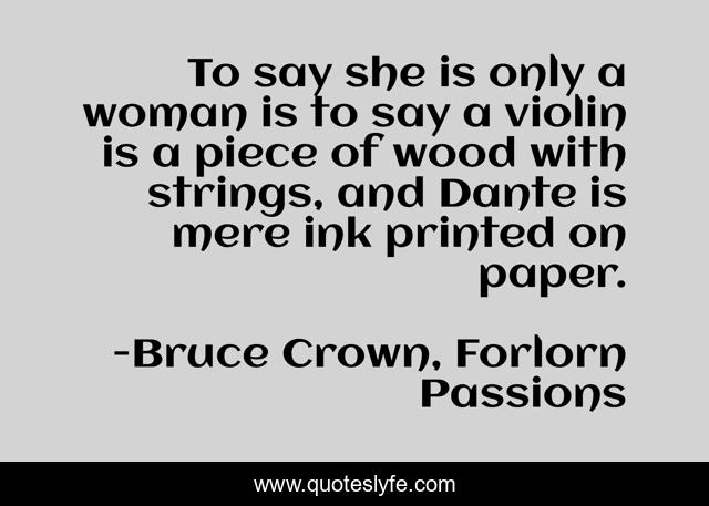 This page presents the quote "To say she is only a woman is to say a violin is a piece of wood with strings, and Dante is mere ink printed on paper.". Author of this quote is Bruce Crown, Forlorn Passions. This quote is about passions, woman, string, beauty, forlorn, dante, paper, adulation, wood,.