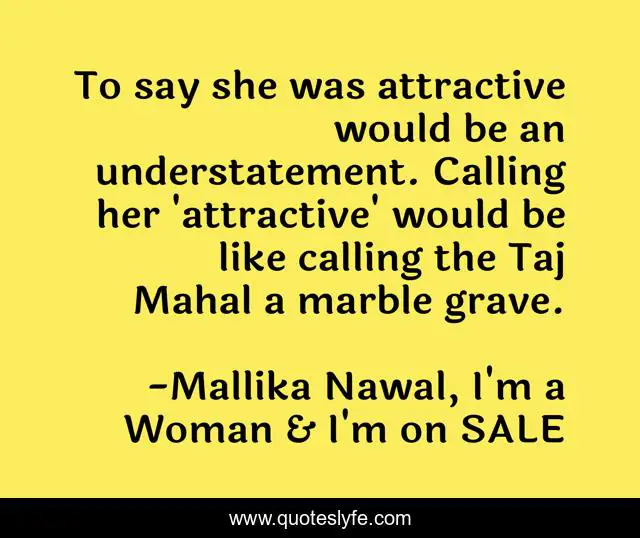 "Mallika Nawal, I'm a Woman & I'm on SALE Quotes." Quoteslyfe.com, 2025. Sat. 06 Dec. 2025. <https://www.quoteslyfe.com/quote/To-say-she-was-attractive-would-be-177395>.