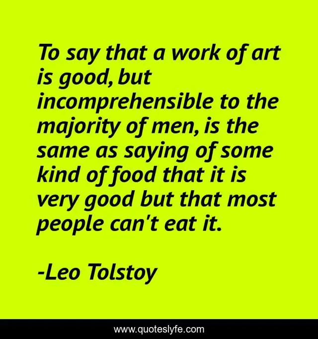 This page presents the quote "To say that a work of art is good, but incomprehensible to the majority of men, is the same as saying of some kind of food that it is very good but that most people can't eat it.". Author of this quote is Leo Tolstoy. This quote is about work, good, art,.