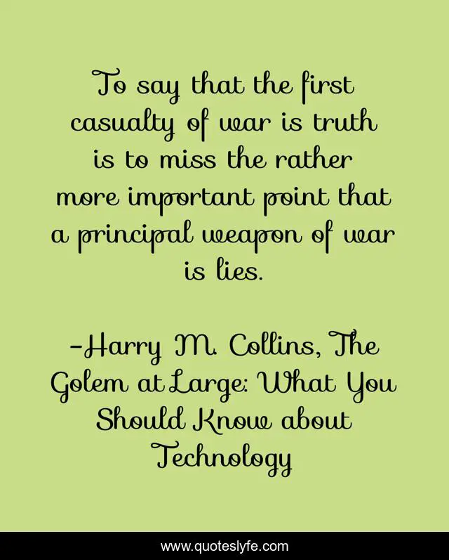 This page presents the quote "To say that the first casualty of war is truth is to miss the rather more important point that a principal weapon of war is lies.". Author of this quote is Harry M. Collins, The Golem at Large: What You Should Know about Technology. This quote is about lie, technology, war, truth, science,.