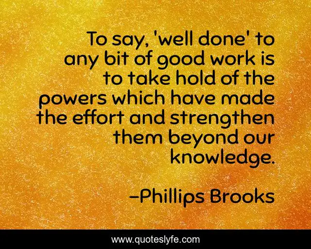 This page presents the quote "To say, 'well done' to any bit of good work is to take hold of the powers which have made the effort and strengthen them beyond our knowledge.". Author of this quote is Phillips Brooks. This quote is about work, good, effort,.