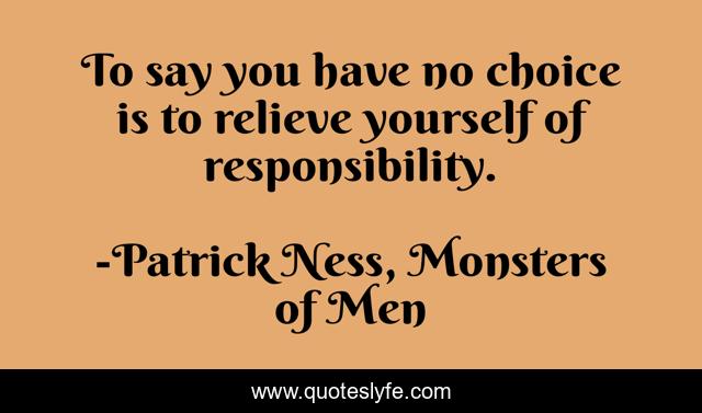 This page presents the quote "To say you have no choice is to relieve yourself of responsibility.". Author of this quote is Patrick Ness, Monsters of Men. This quote is about cowardice, responsibility, choice,.