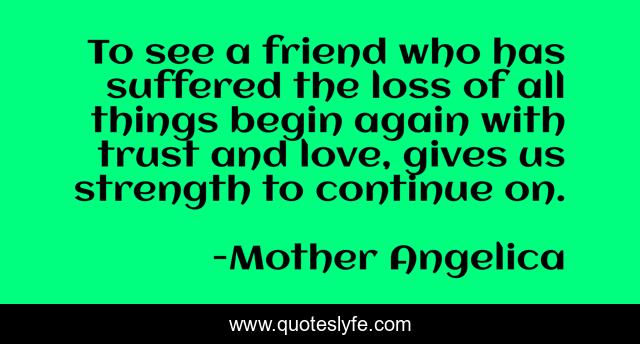 This page presents the quote "To see a friend who has suffered the loss of all things begin again with trust and love, gives us strength to continue on.". Author of this quote is Mother Angelica. This quote is about loss, trust, love, affection,.