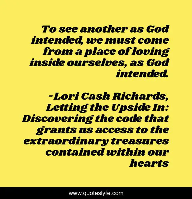 "Lori Cash Richards, Letting the Upside In: Discovering the code that grants us access to the extraordinary treasures contained within our hearts Quotes." Quoteslyfe.com, 2025. Sat. 06 Dec. 2025. <https://www.quoteslyfe.com/quote/To-see-another-as-God-intended-we-146840>.