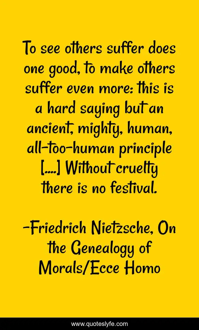 This page presents the quote "To see others suffer does one good, to make others suffer even more: this is a hard saying but an ancient, mighty, human, all-too-human principle [....] Without cruelty there is no festival.". Author of this quote is Friedrich Nietzsche. This quote is about suffering, sadism,.