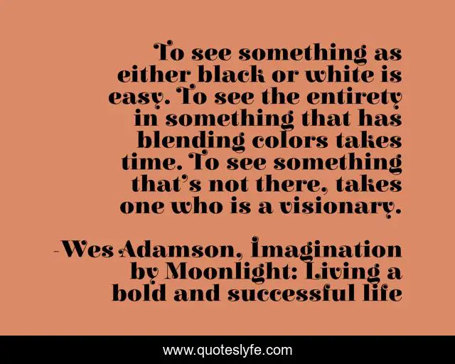 This page presents the quote "To see something as either black or white is easy. To see the entirety in something that has blending colors takes time. To see something that’s not there, takes one who is a visionary.". Author of this quote is Wes Adamson, Imagination by Moonlight: Living a bold and successful life. This quote is about confidence, visionary, positive, motivational, invent, creative, optimistic, inspirational, imagine,.
