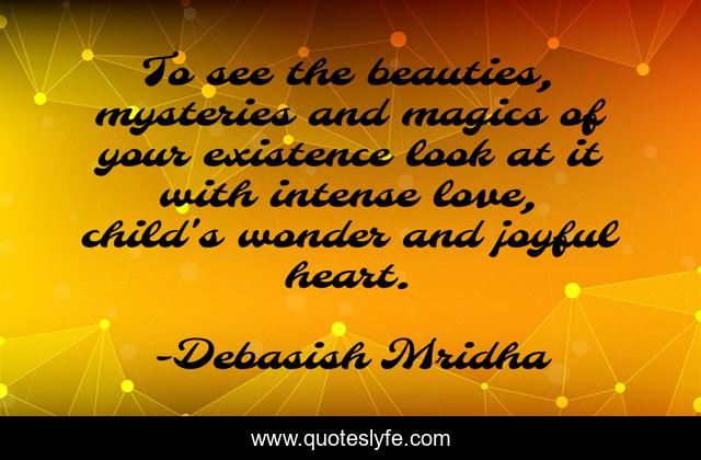 This page presents the quote "To see the beauties, mysteries and magics of your existence look at it with intense love, child's wonder and joyful heart.". Author of this quote is Debasish Mridha. This quote is about life, love, knowledge, inspirational, intelligence, philosophy, wisdom, quotes, affection,.