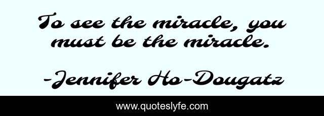 This page presents the quote "To see the miracle, you must be the miracle.". Author of this quote is Jennifer Ho-Dougatz. This quote is about miracles, jennifer-ho, jennifer-ho-dougatz, miracle,.