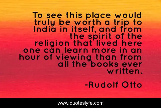 This page presents the quote "To see this place would truly be worth a trip to India in itself, and from the spirit of the religion that lived here one can learn more in an hour of viewing than from all the books ever written.". Author of this quote is Rudolf Otto. This quote is about see, place, learn,.