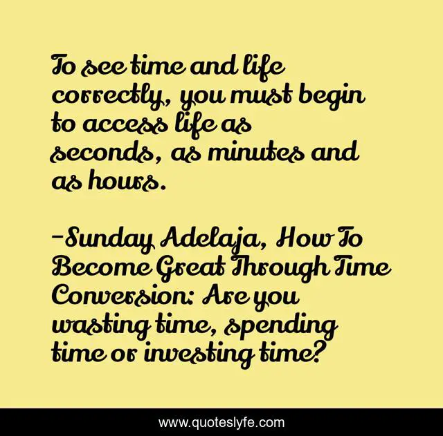 This page presents the quote "To see time and life correctly, you must begin to access life as seconds, as minutes and as hours.". Author of this quote is Sunday Adelaja, How To Become Great Through Time Conversion: Are you wasting time, spending time or investing time?. This quote is about convert, time-conversion, productivity, wealth, gift, greatness, life, great, value,.