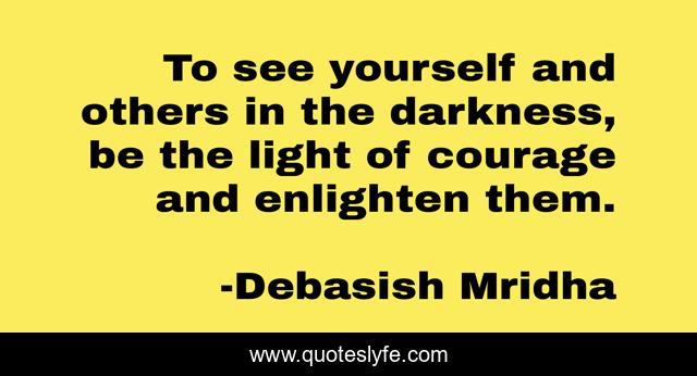 This page presents the quote "To see yourself and others in the darkness, be the light of courage and enlighten them.". Author of this quote is Debasish Mridha. This quote is about darkness-and-light, enlighten-them, philosophy, debasish-mridha, quotes, be-the-light, courage, debasish-mridha-md, inspirational,.