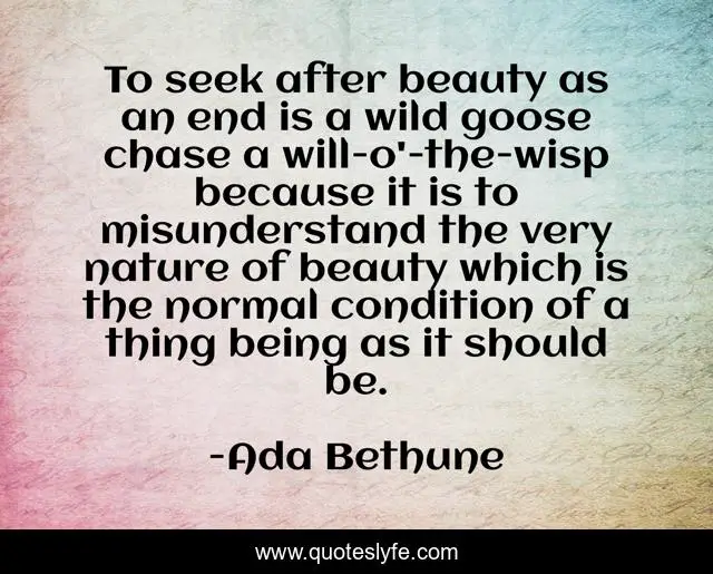 This page presents the quote "To seek after beauty as an end is a wild goose chase a will-o'-the-wisp because it is to misunderstand the very nature of beauty which is the normal condition of a thing being as it should be.". Author of this quote is Ada Bethune. .