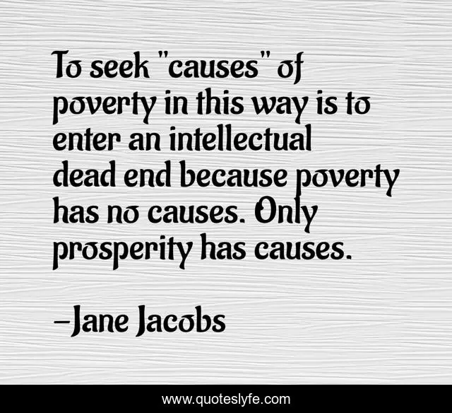 This page presents the quote "To seek "causes" of poverty in this way is to enter an intellectual dead end because poverty has no causes. Only prosperity has causes.". Author of this quote is Jane Jacobs. This quote is about prosperity, poverty,.