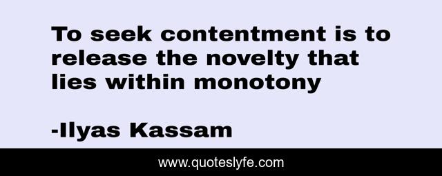 This page presents the quote "To seek contentment is to release the novelty that lies within monotony". Author of this quote is Ilyas Kassam. This quote is about self, philosophy, novelty, contentment, monotony, happiness,.