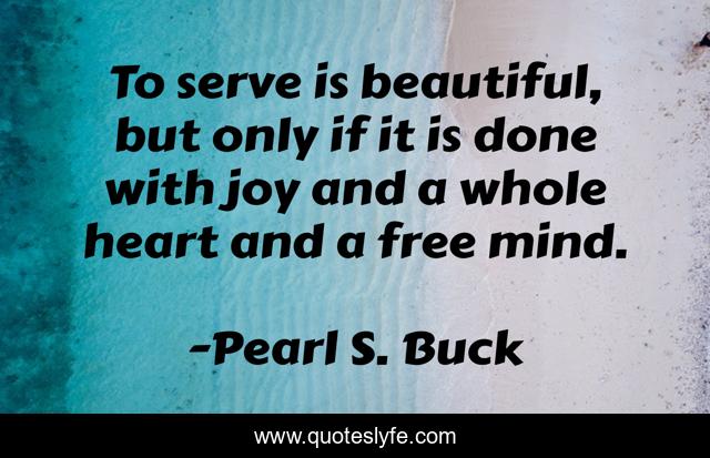 This page presents the quote "To serve is beautiful, but only if it is done with joy and a whole heart and a free mind.". Author of this quote is Pearl S. Buck. This quote is about joy, social-justice, purpose-of-life, happiness,.