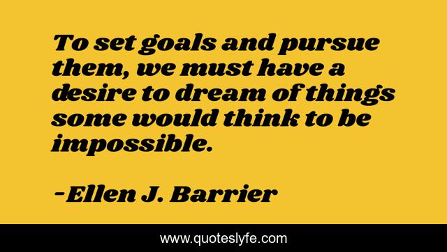 This page presents the quote "To set goals and pursue them, we must have a desire to dream of things some would think to be impossible.". Author of this quote is Ellen J. Barrier. This quote is about goals, dreams,.