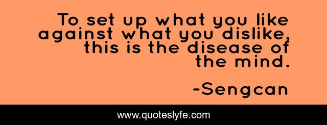 This page presents the quote "To set up what you like against what you dislike, this is the disease of the mind.". Author of this quote is Sengcan. This quote is about dislikes, likes, conflict, aversion,.