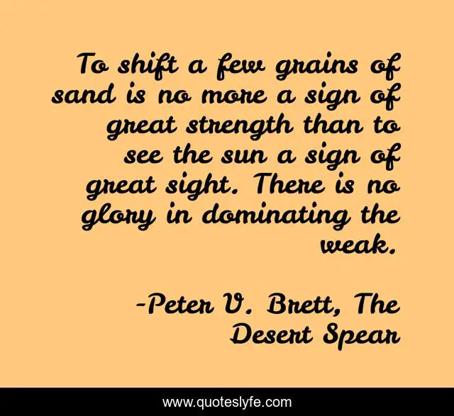 This page presents the quote "To shift a few grains of sand is no more a sign of great strength than to see the sun a sign of great sight. There is no glory in dominating the weak.". Author of this quote is Peter V. Brett, The Desert Spear. This quote is about great, strength, glory, grains, shift, weak, sign, sand, dominating,.