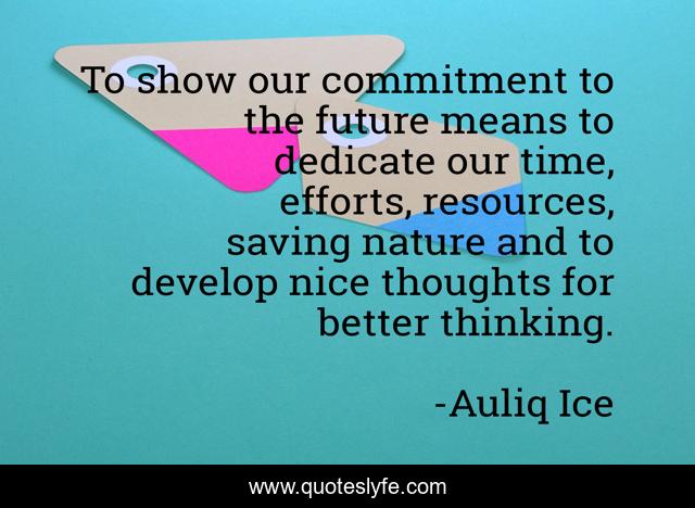 This page presents the quote "To show our commitment to the future means to dedicate our time, efforts, resources, saving nature and to develop nice thoughts for better thinking.". Author of this quote is Auliq Ice. This quote is about development, succes, future-plans, success, positive, motivational, confidence, inspiarational, future,.