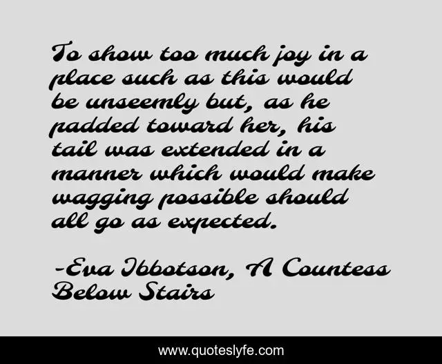 This page presents the quote "To show too much joy in a place such as this would be unseemly but, as he padded toward her, his tail was extended in a manner which would make wagging possible should all go as expected.". Author of this quote is Eva Ibbotson, A Countess Below Stairs. .