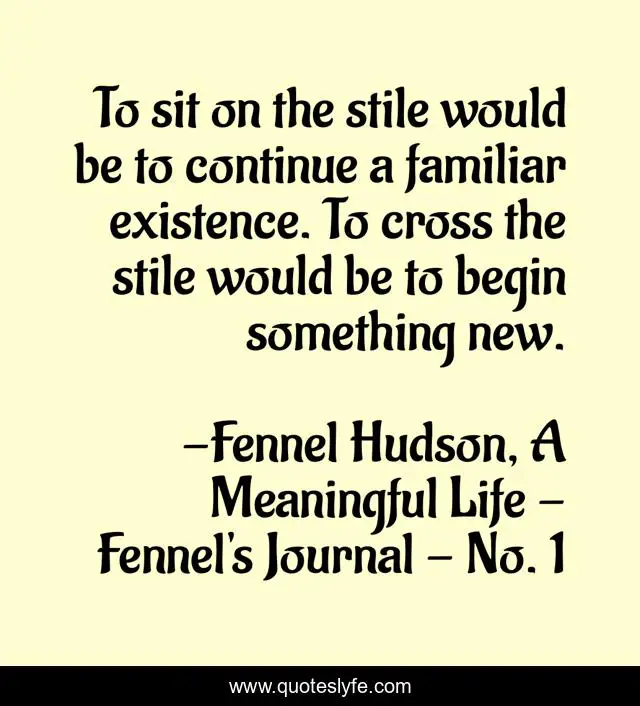 This page presents the quote "To sit on the stile would be to continue a familiar existence. To cross the stile would be to begin something new.". Author of this quote is Fennel Hudson, A Meaningful Life - Fennel's Journal - No. 1. This quote is about change-your-life, lifestyle, adventure,.