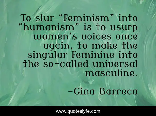 This page presents the quote "To slur “feminism” into “humanism” is to usurp women’s voices once again, to make the singular feminine into the so-called universal masculine.". Author of this quote is Gina Barreca. This quote is about humanism, feminism, voices,.