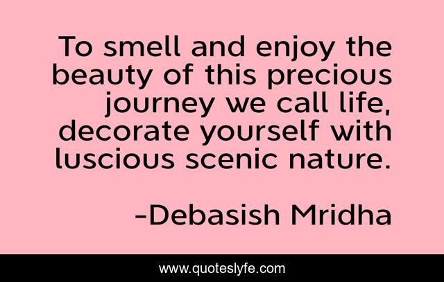 This page presents the quote "To smell and enjoy the beauty of this precious journey we call life, decorate yourself with luscious scenic nature.". Author of this quote is Debasish Mridha. This quote is about beauty, nature, philosophy, debasish-mridha, celebrate-yourself, quotes, inspirational, enthusiasm, debasish-mridha-m-d,.
