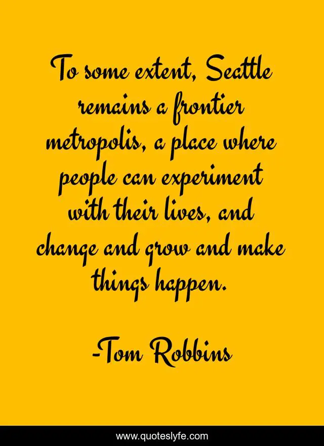 This page presents the quote "To some extent, Seattle remains a frontier metropolis, a place where people can experiment with their lives, and change and grow and make things happen.". Author of this quote is Tom Robbins. This quote is about place, grow, people,.