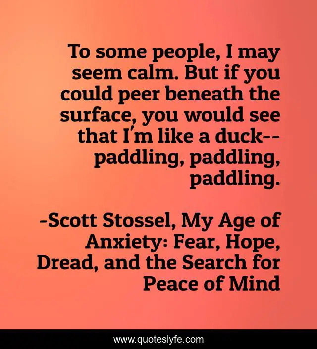 This page presents the quote "To some people, I may seem calm. But if you could peer beneath the surface, you would see that I'm like a duck--paddling, paddling, paddling.". Author of this quote is Scott Stossel, My Age of Anxiety: Fear, Hope, Dread, and the Search for Peace of Mind. .