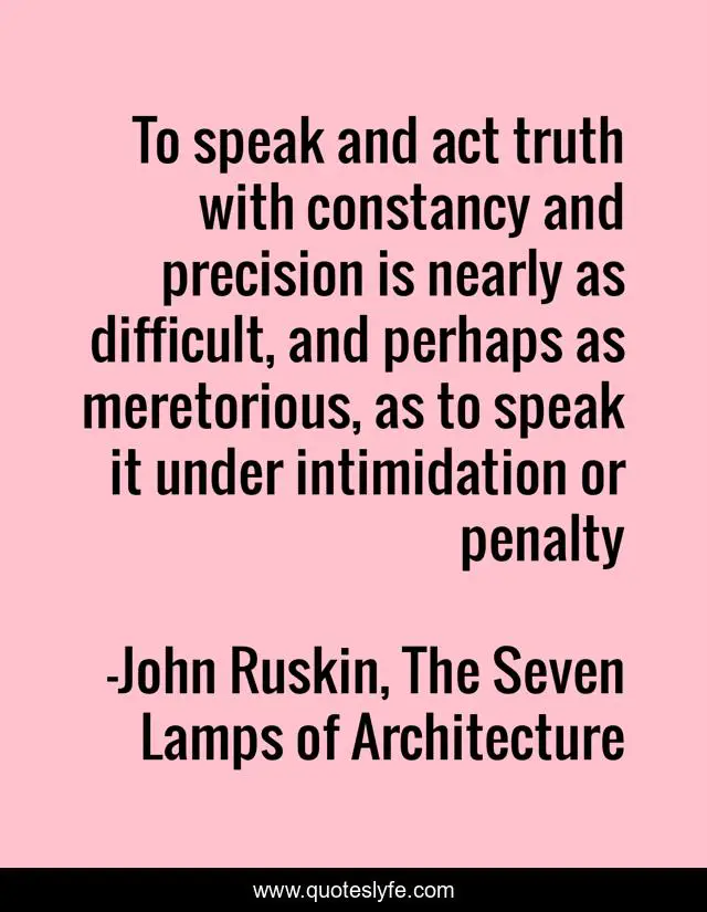 This page presents the quote "To speak and act truth with constancy and precision is nearly as difficult, and perhaps as meretorious, as to speak it under intimidation or penalty". Author of this quote is John Ruskin, The Seven Lamps of Architecture. This quote is about art, truth,.