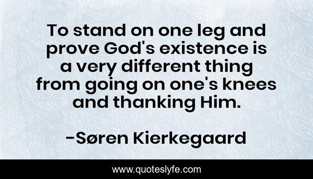 This page presents the quote "To stand on one leg and prove God's existence is a very different thing from going on one's knees and thanking Him.". Author of this quote is Søren Kierkegaard. This quote is about faith, existentialism, christianity, religion, subjectivity, philosophy-of-religion,.
