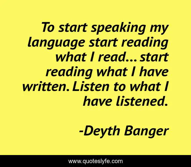 This page presents the quote "To start speaking my language start reading what I read... start reading what I have written. Listen to what I have listened.". Author of this quote is Deyth Banger. This quote is about start, language, listened, listen,.