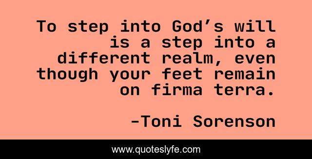 This page presents the quote "To step into God’s will is a step into a different realm, even though your feet remain on firma terra.". Author of this quote is Toni Sorenson. This quote is about faith, hope, god,.