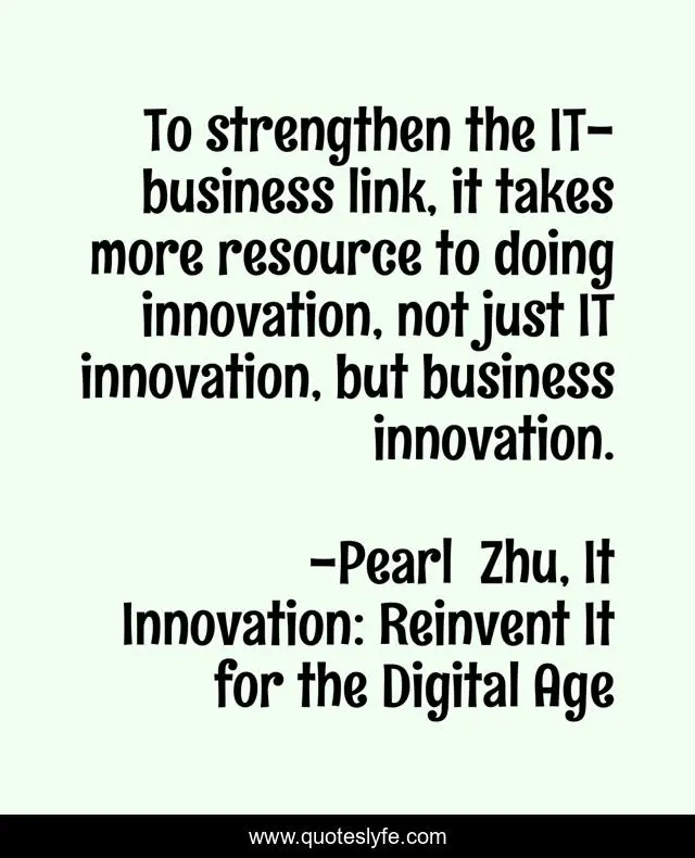 This page presents the quote "To strengthen the IT-business link, it takes more resource to doing innovation, not just IT innovation, but business innovation.". Author of this quote is Pearl Zhu, It Innovation: Reinvent It for the Digital Age. This quote is about it-innovation, innovation,.