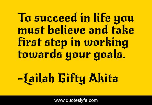 This page presents the quote "To succeed in life you must believe and take first step in working towards your goals.". Author of this quote is Lailah Gifty Akita. This quote is about believe-and-achieve, believe, success-strategies, success,.