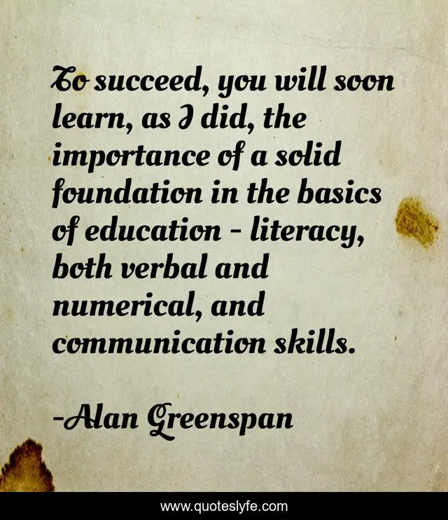 This page presents the quote "To succeed, you will soon learn, as I did, the importance of a solid foundation in the basics of education - literacy, both verbal and numerical, and communication skills.". Author of this quote is Alan Greenspan. This quote is about foundation, education,.
