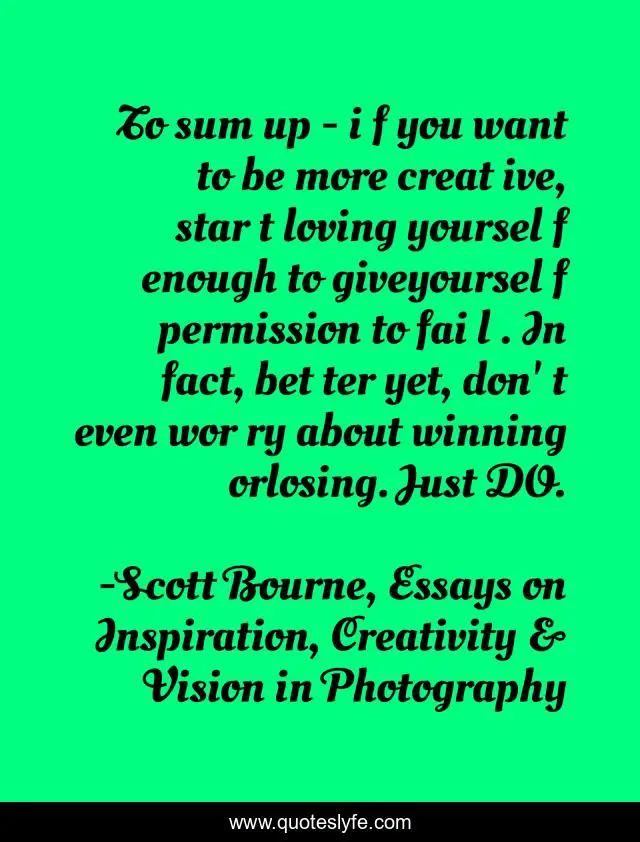 This page presents the quote "To sum up - i f you want to be more creat ive, star t loving yoursel f enough to giveyoursel f permission to fai l . In fact, bet ter yet, don' t even wor ry about winning orlosing. Just DO.". Author of this quote is Scott Bourne, Essays on Inspiration, Creativity & Vision in Photography. .