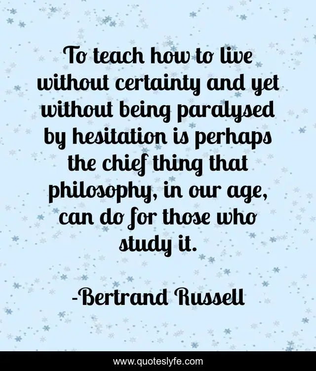 This page presents the quote "To teach how to live without certainty and yet without being paralysed by hesitation is perhaps the chief thing that philosophy, in our age, can do for those who study it.". Author of this quote is Bertrand Russell. This quote is about live, philosophy, study,.