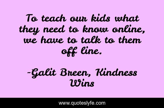 This page presents the quote "To teach our kids what they need to know online, we have to talk to them off line.". Author of this quote is Galit Breen, Kindness Wins. This quote is about online-education, online-etiquette, social-media, internet-etiquette, parenting-advice, internet-manners, kindness-to-others, cyberbullying, parenting,.