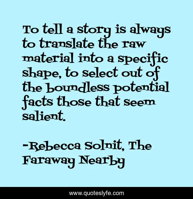 This page presents the quote "To tell a story is always to translate the raw material into a specific shape, to select out of the boundless potential facts those that seem salient.". Author of this quote is Rebecca Solnit, The Faraway Nearby. This quote is about storytelling, writing,.