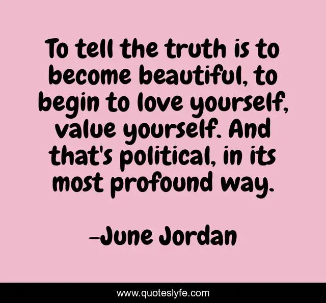 This page presents the quote "To tell the truth is to become beautiful, to begin to love yourself, value yourself. And that's political, in its most profound way.". Author of this quote is June Jordan. This quote is about beautiful, love, affection,.