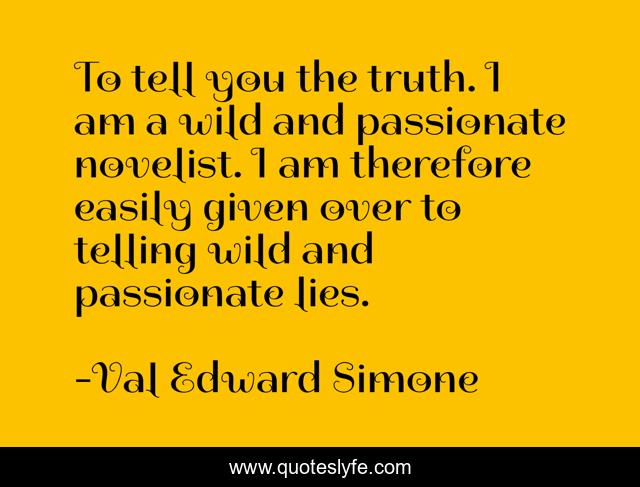 This page presents the quote "To tell you the truth. I am a wild and passionate novelist. I am therefore easily given over to telling wild and passionate lies.". Author of this quote is Val Edward Simone. This quote is about funny, comedy, true, humor, truth,.